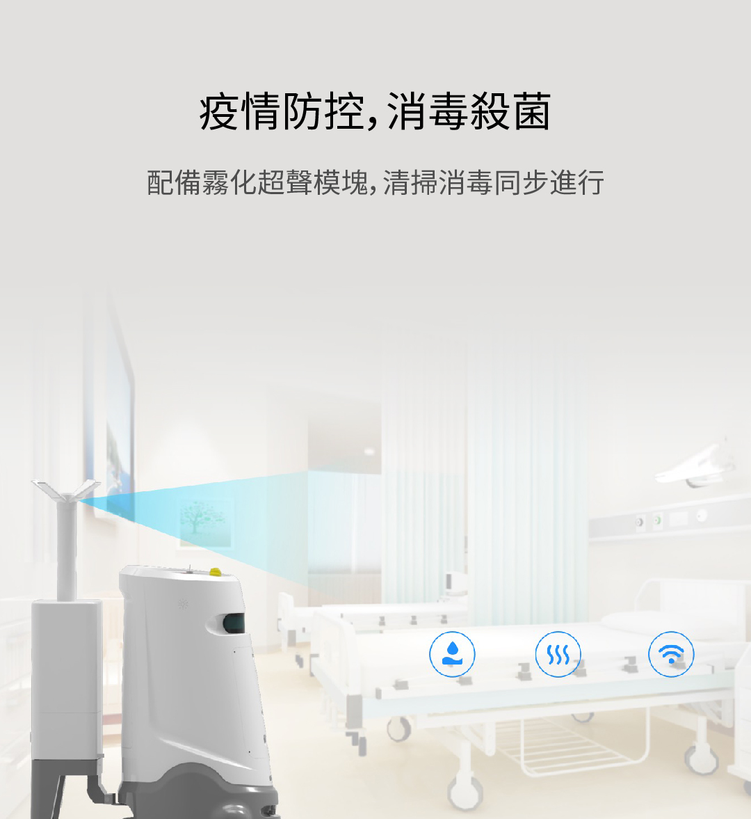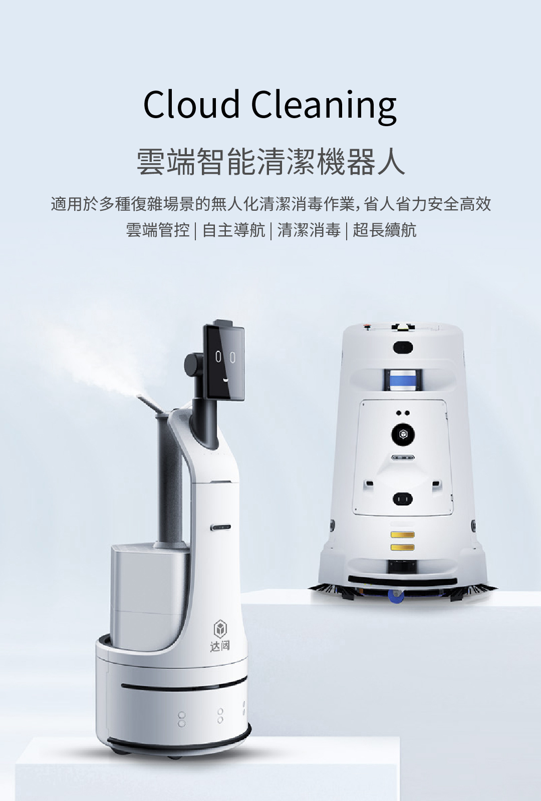 適用於多種複雜場景的無人化清潔消毒作業,省人省力安全高效 雲端管控 | 自主導航 | 清潔消毒 | 超長續航